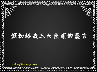 • 光明,一个令人神往的词语,拥有了光明,就能拥有一切美好的事物,假如我是一位盲人,什么都看不见,假如某一天我拥有了只能持续三天的光明,而不是一生的话,这是多么悲哀!